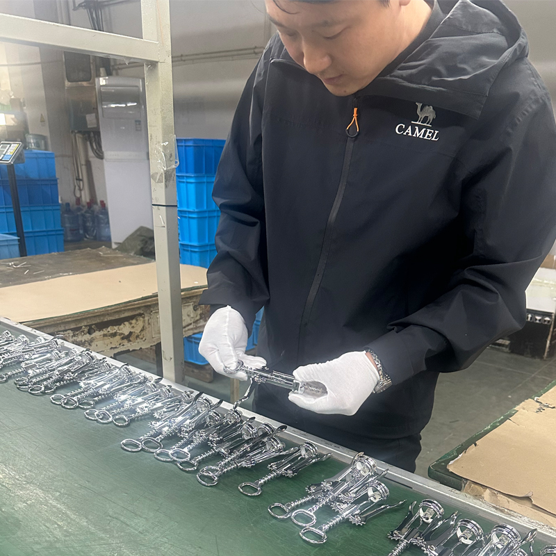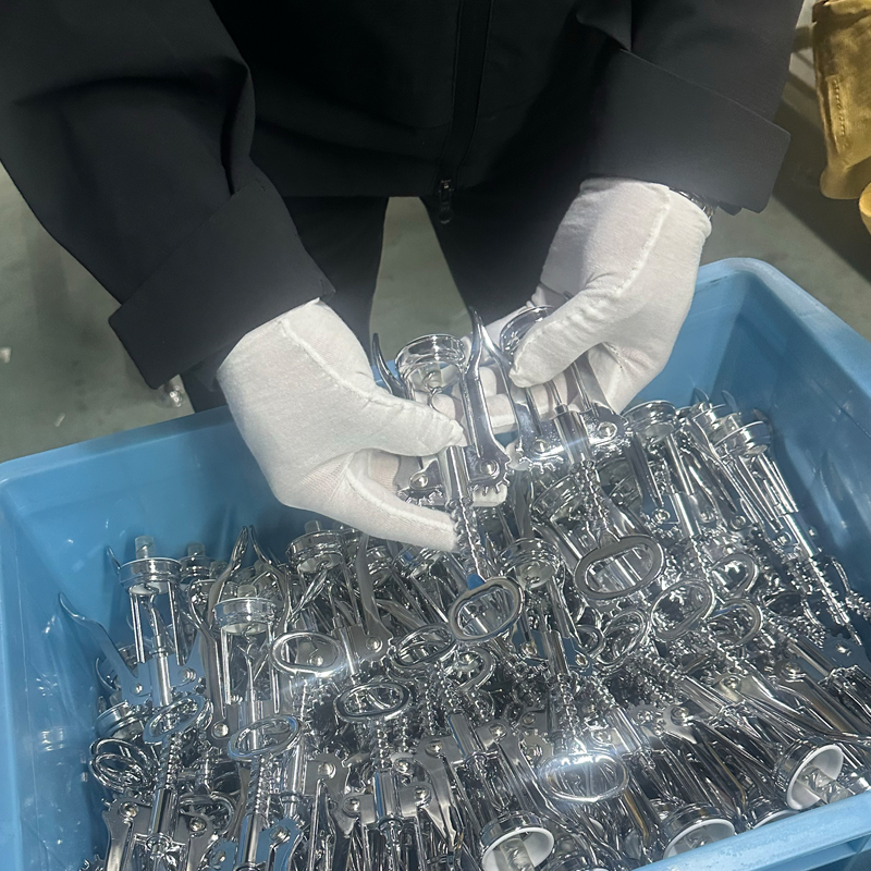 Для покрытия всех компонентов штопора обычно используются методы гальваники или окраски. На этой иллюстрации мы сосредоточимся на гальванике. Обработка гальванических покрытий выполняется сторонним поставщиком, для чего требуются узкоспециализированные помещения, оборудование и отраслевые инженеры с многолетним опытом работы в своей области, а также многочисленные базовые технические специалисты и опытные рабочие. Это очень сложный процесс. Мы поддерживаем долгосрочное сотрудничество с поставщиками, имеющими 30-летний опыт работы в отрасли, обеспечивая стабильность продукции. Это также гарантирует, что различные производственные проблемы, возникающие в ходе производства, могут быть решены быстро, профессионально и эффективно. Эти меры помогают обеспечить производственные циклы таких товаров, как винные аксессуары, кухонная утварь и штопоры, а также поддерживают планы продаж клиентов.